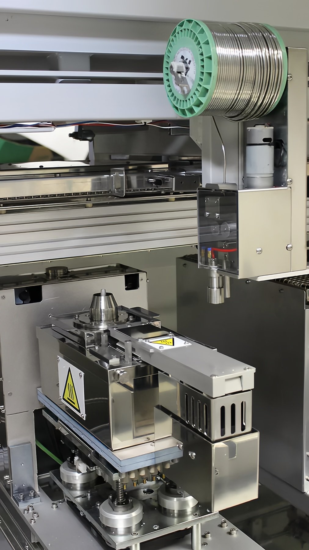 Easy, rapid non-contact solder pot changeover is facilitated via the optional heated pot exchange trolley.